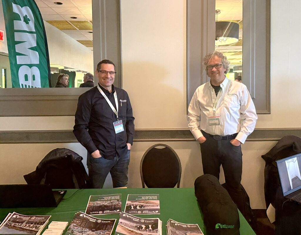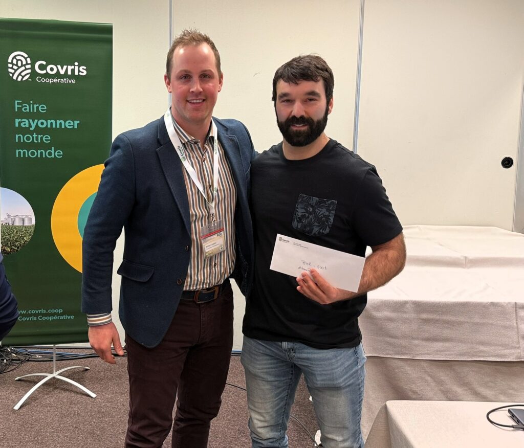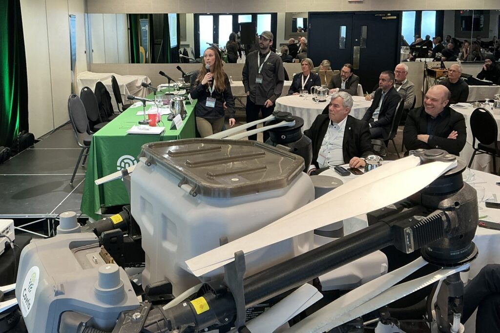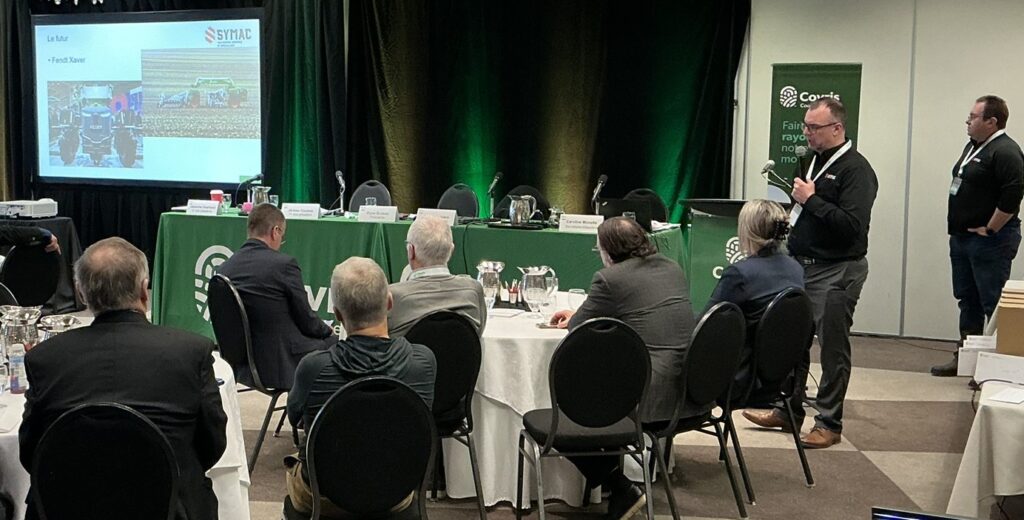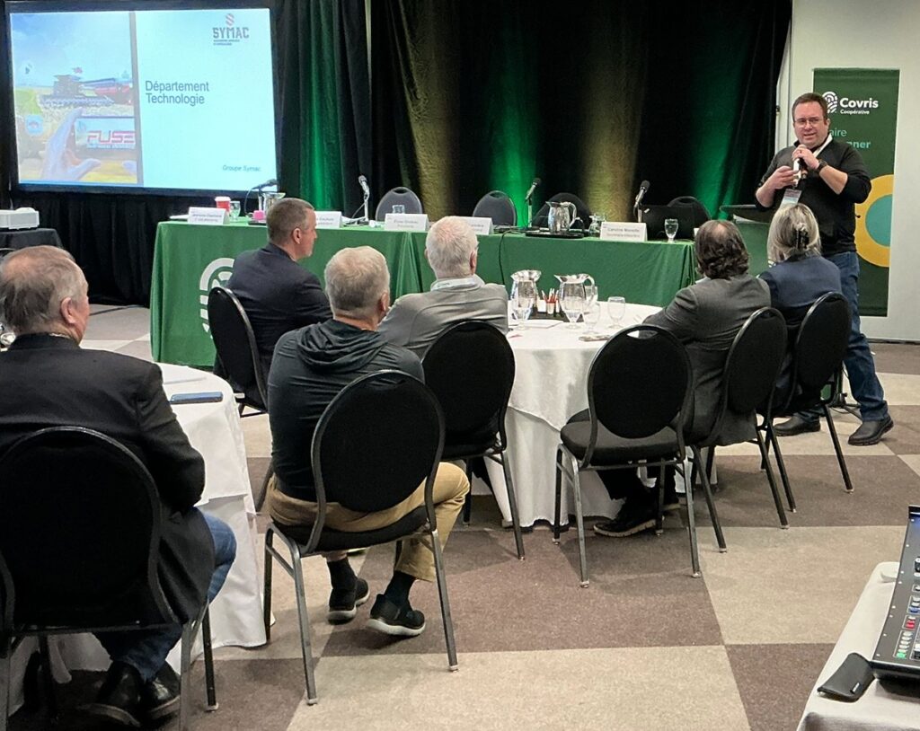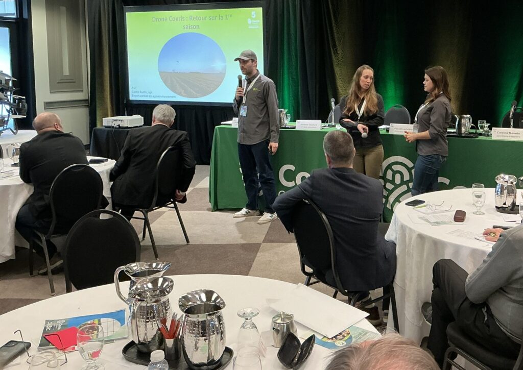 La journée s’est terminée avec deux présentations. La première étant présentée par M. Philippe Tremblay, directeur principal, et M. Éric Dubreuil, directeur technologie, chez Groupe Symac sur le nouveau département de technologie Ag Techno. La seconde présentation a été présentée par M. Cédric Austin, expert-conseil en agroenvironnement et pilote de drone chez Covris, accompagné par Mme Maude Denoncourt et Mme Isabelle Duval, toutes deux expertes-conseils chez Covris. La présentation portait sur le service de drone offert chez Covris pour l’application de semences et d’engrais.