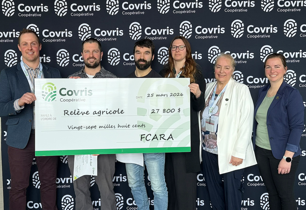 Mme Jeannine Chartrand, 2e vice-présidente chez Covris, a procédé à la remise des bourses aux membres du programme FCARA (Fonds coopératif d’aide à la relève agricole). Cette année, Covris a remis 28 700 $ aux cinq participants du programme.